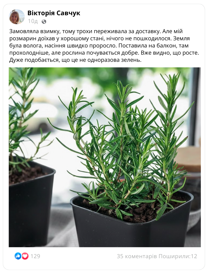 Ми доставляємо насіння насіння вічнозеленого розмарину у горщиках П9 за 2–4 дні Новою поштою  з оплатою при отриманні. Перед відправкою перевіряємо замовлення на відповідність сорту у три етапи, щоб ви отримали саме те, що обрали!