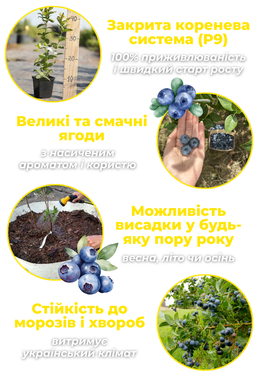 • Висока врожайність – з дорослого куща до 6–8 кг ягід.