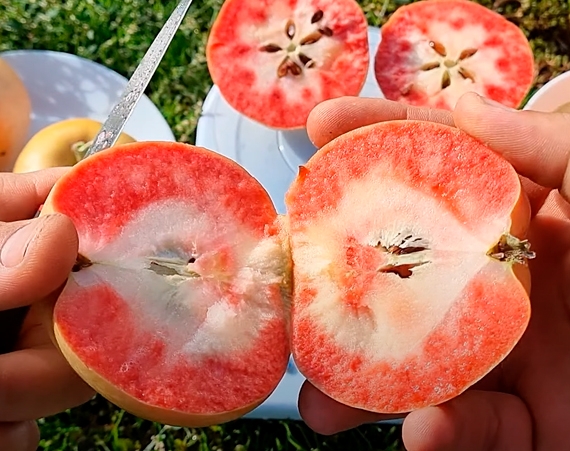 Колір плоду жовтий з інтенсивним яскраво-червоним рум'янцем. М'якоть насиченого рожевого кольору, дуже соковита і солодка, середньої щільності.